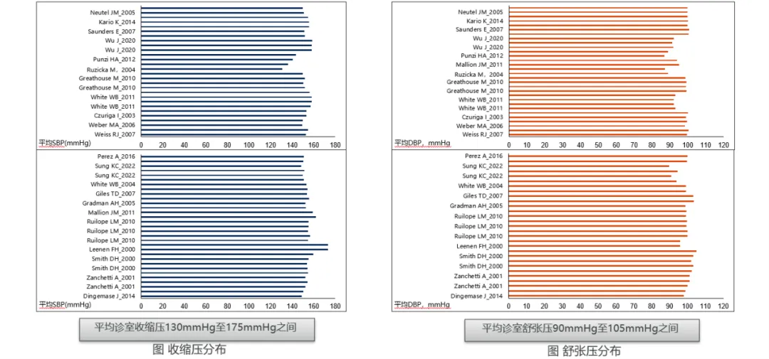 該研究是一項系統性文獻綜述和網狀薈萃分析,涵蓋了2000年1月至2023年12月間發表的文獻,對比了美阿沙坦鉀(azilsartan medoxomil,簡稱AZL-M)與其他常用一線降壓藥物(ARB、ACEI、ARNI、β-受體阻滯劑、鈣通道阻滯劑)在輕至中度高血壓患者中的降壓療效。評估篩選標準包括輕至中度高血壓患者、隨機對照試驗(RCT)等,最終納入21項RCT研究,其中大多數研究將安慰劑作為對照,部分研究(9 項)將降壓藥同時作為干預和對照,研究報告的基線平均診室血壓如下: