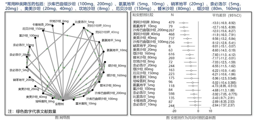 網狀薈萃分析結果顯示:與安慰劑對照,在常用降壓藥(ARB、ACEI、ARNI、β-受體阻滯劑、鈣通道阻滯劑)中,美阿沙坦鉀80mg的診室收縮壓和舒張壓降幅均最大;